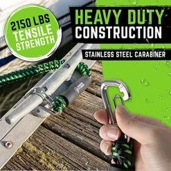 - Heavy Duty Construction: Tensile strength is 2150lbs which means you can confidently dock boats up to 4500lbs. The stainless steel carabiner clip prevents salt water corrosion.