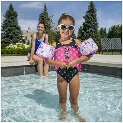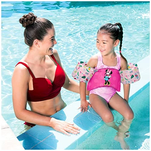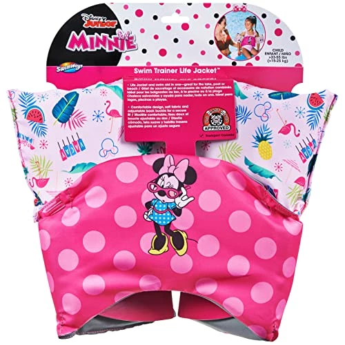 - MINNIE MOUSE LEARN-TO-SWIM LIFE JACKET: Features a Minnie Mouse theme with a bright pink polka dot design for a magical day at the pool