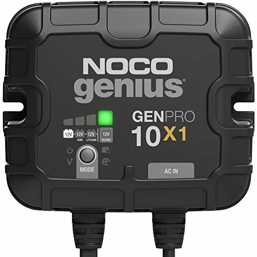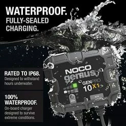 - What’s in the box – GENPRO10X1 10-amp 1-bank waterproof onboard marine battery chargers (120-240VAC) with a 72-Inch DC cables with 3/8-inch eyelets and a 72-inch Type-B AC cable, (2) self-tapping mounting screws, user guide, and 3-year warranty.