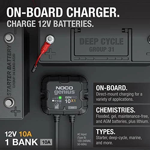 - Multiple banks – A one-bank onboard battery charger rated a 10-amps – 10-amps per bank – for 12-volt batteries, including marine, boat, starter, and deep-cycle batteries.