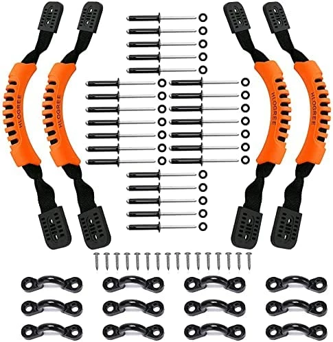 HLOGREE Kayak Handles 2/4 Pack Very nice solid handles and hoop connectors. Easy to install. We left our old handles (which had broken due to sun damage and only the bases were left) in place and put these in the same area. You will need a drill and a rivet gun to install. There are lots of YouTube how to videos out there but it is very easy.