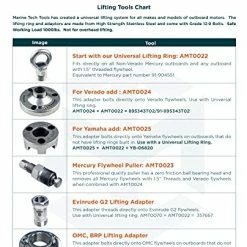 This review is written for both the Mercury Verado Lifting Adapter (part AMT0024) and the Universal Lifting Ring (part AMT0022)(total price was $144)The Mercury Verado Lifting Adapter disc itself is about 6-inches in diameter and is machined from some form of paramagnetic steel.The Lifting Ring thread size is 1.5β x16 which should fit the earlier Mercury outboards with threaded flywheels without the need for additional adapters.With respect to both components, the machining quality is excellent, and the finish quality is high for tool-grade products.Appropriate mounting hardware is included. The official Mercury product includes the instructions to torque the attachment bolts to 15 to 20 foot-pounds.The official Mercury counterpart (91-895343T02) has the same lifting capacity of 1000 pounds and includes the flywheel removal tool, but is looks more βhomemadeβ and costs $275. Sierra brands also offers a similar product (18-9897) which appears even more βrusticβ and starts at $233.A Marine Tech Tool Mercury Flywheel Puller (AMT0023) is also available for $47 but is not being evaluated at this time. The official Mercury counterpart (91-849154T1) sells for $150.Unlike the official Mercury product, the Marine Tech Tool product facilitates interchanging the lifting ring with either Yamaha or Mercury adapters.