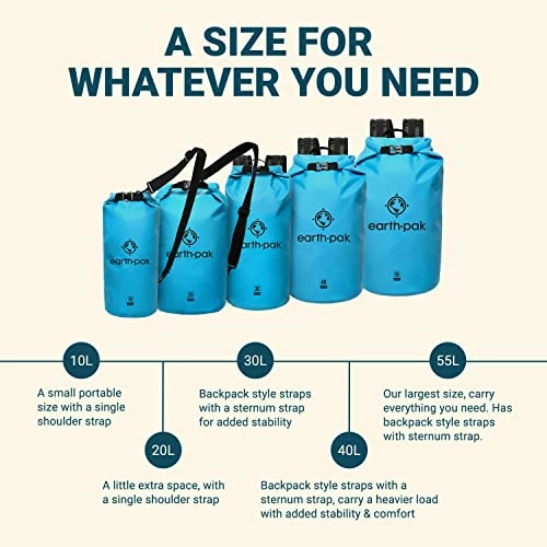 - SHOULDER STRAP: 10L & 20L dry bags come with a 24-42 Inch single shoulder strap. 30L, 40L, and 55L waterproof backpacks are equipped with backpack style shoulder straps that also come with a sternum strap for added stability. Our new 55L also comes equipped with a heavy duty waist-belt, which relieves added pressure and helps support your load.